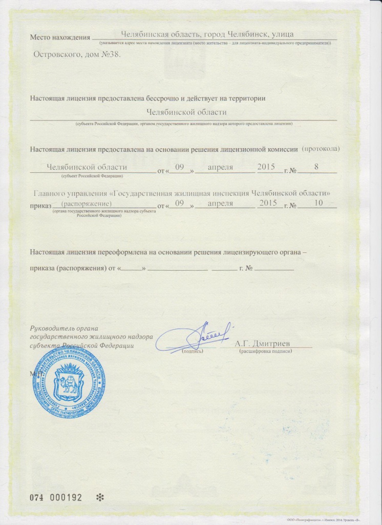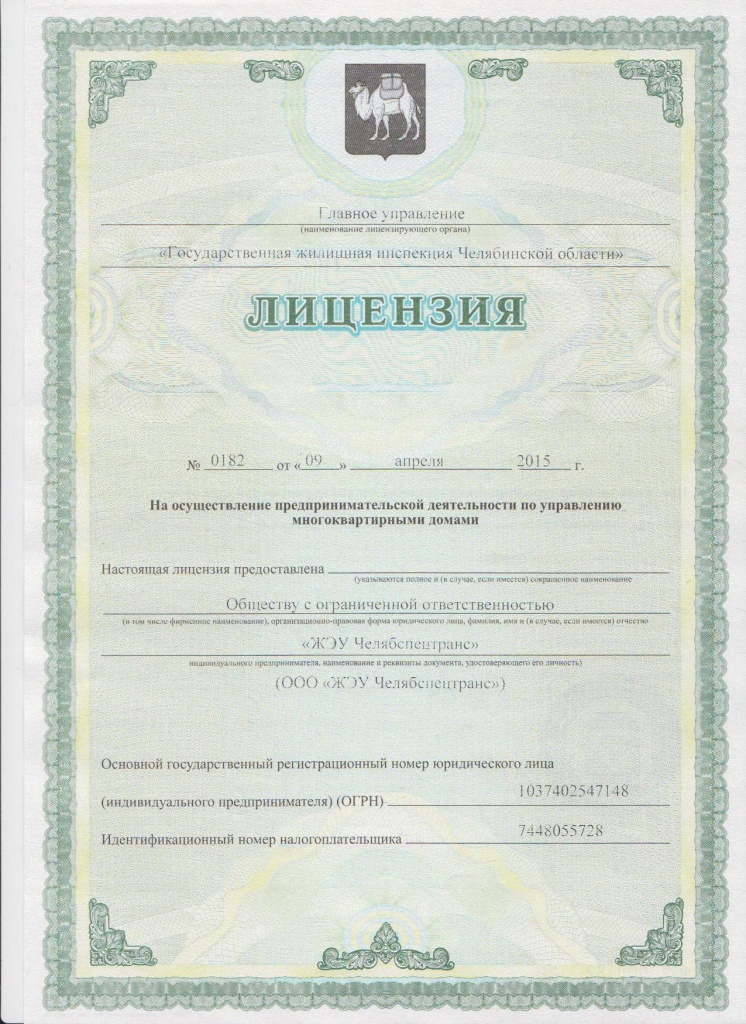 Лицензия на осуществление предпринимательской деятельности в области управления многоквартирными домами № 0182 от 09.04.2015 г.
